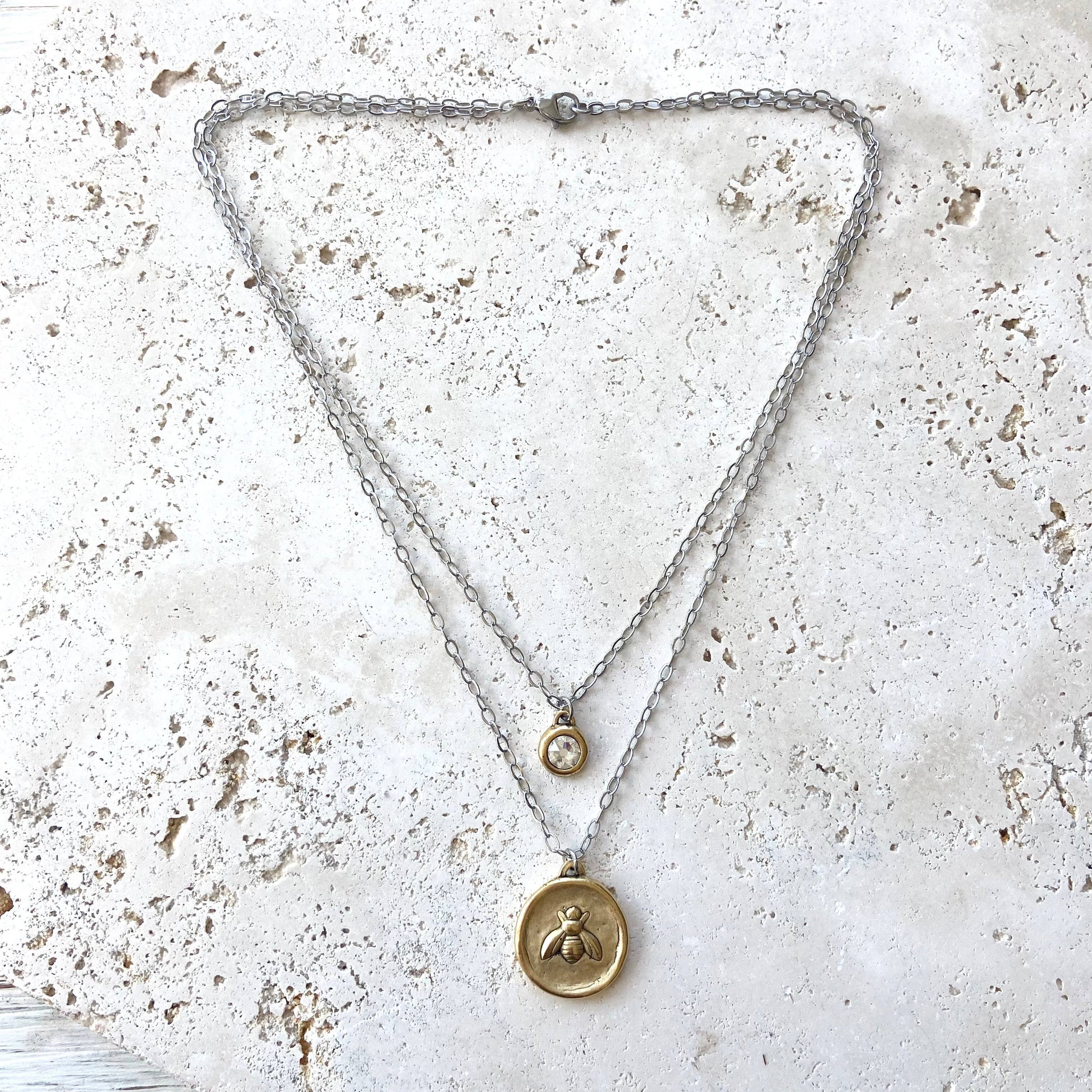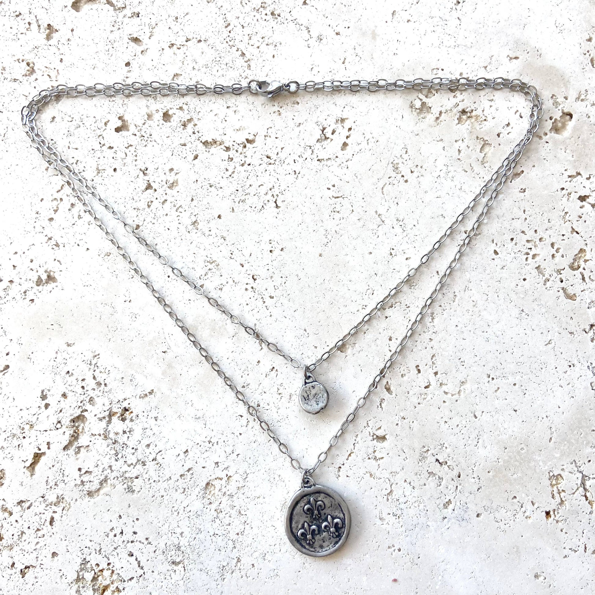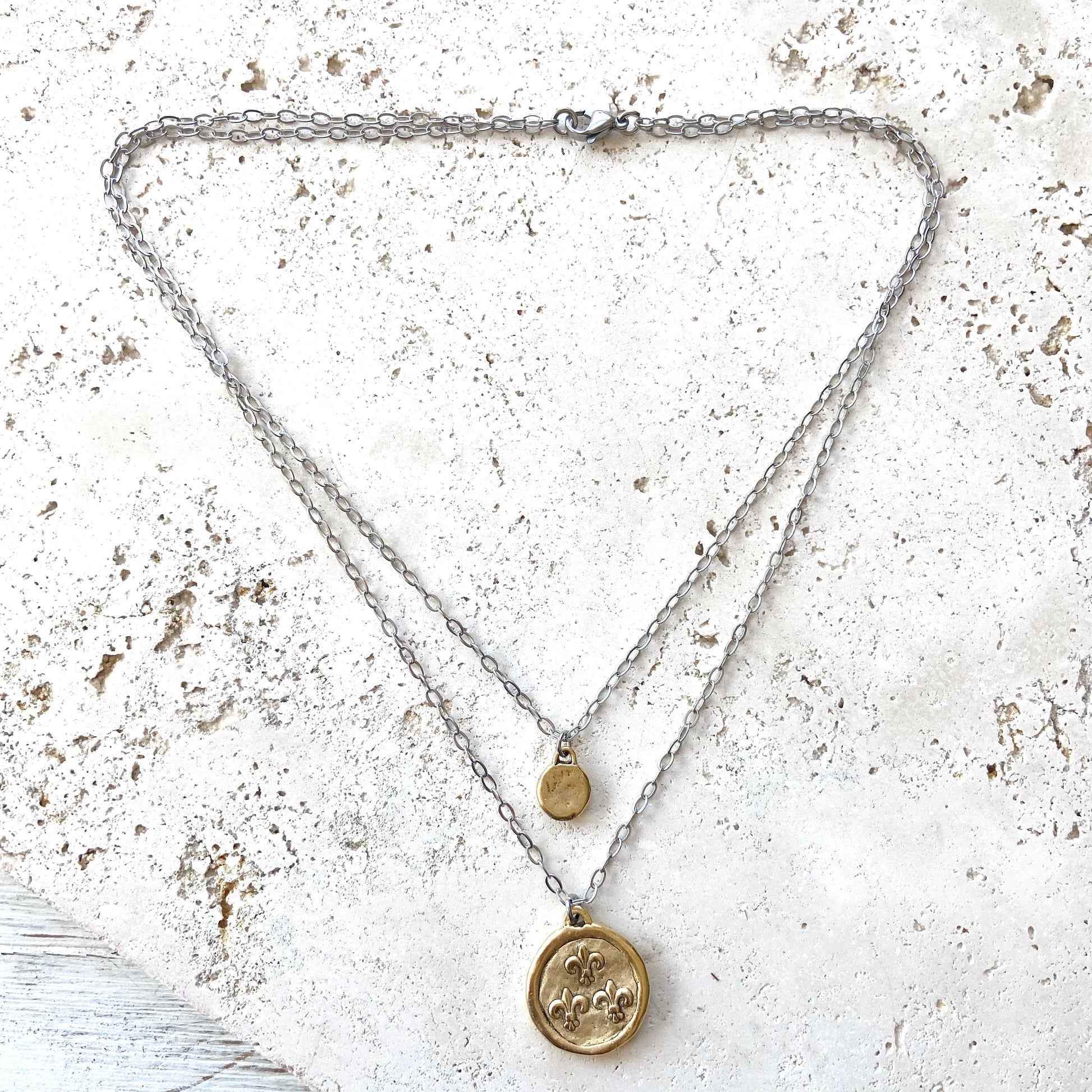 How cute are these coin necklaces? Two layers (one piece) hand casted bees coins. If you turn them over you will see 3 fleur de lys symbols. Stainless steel chain and adjustable up to 20”