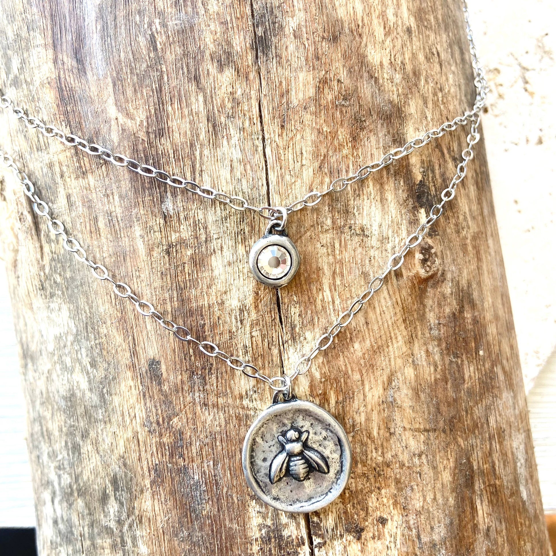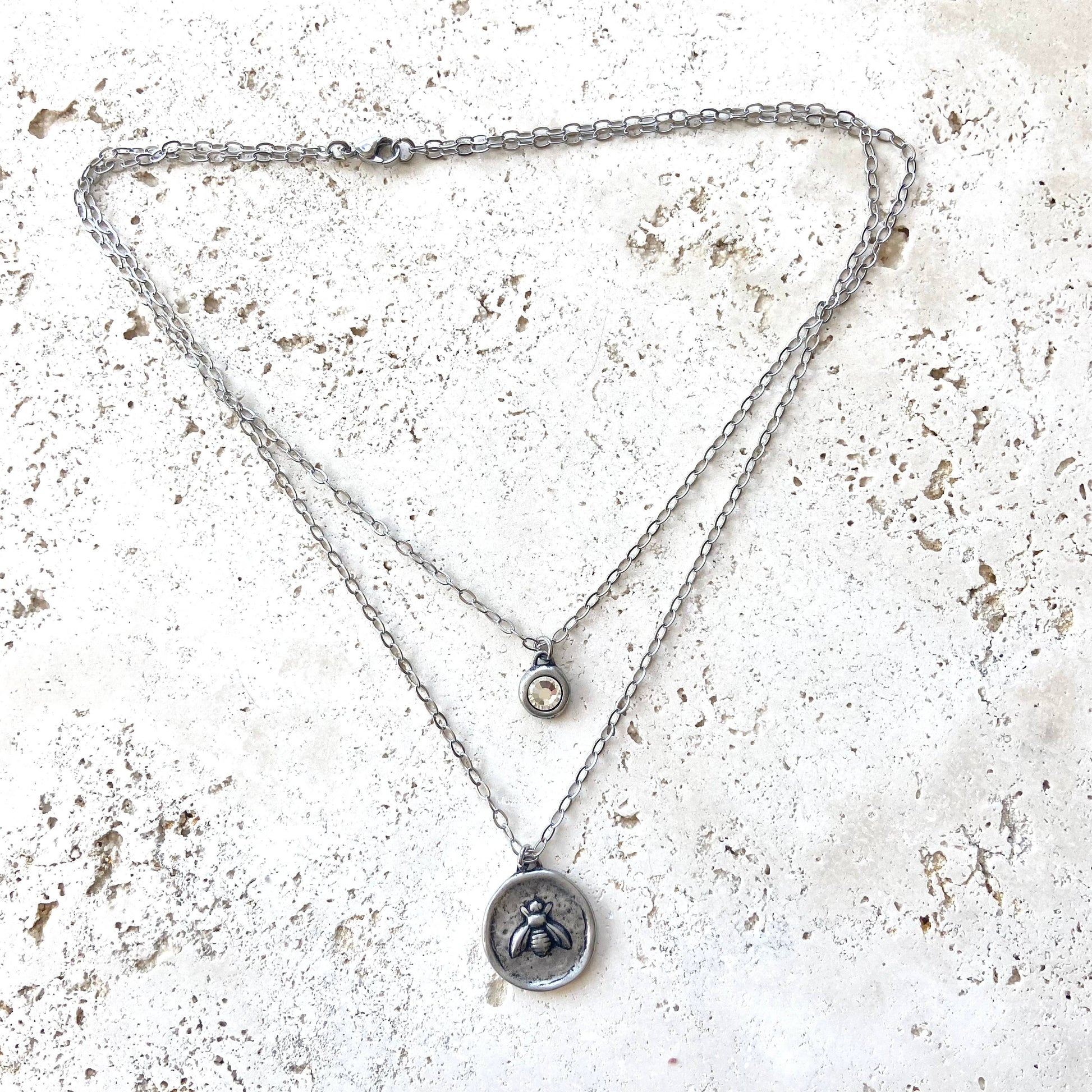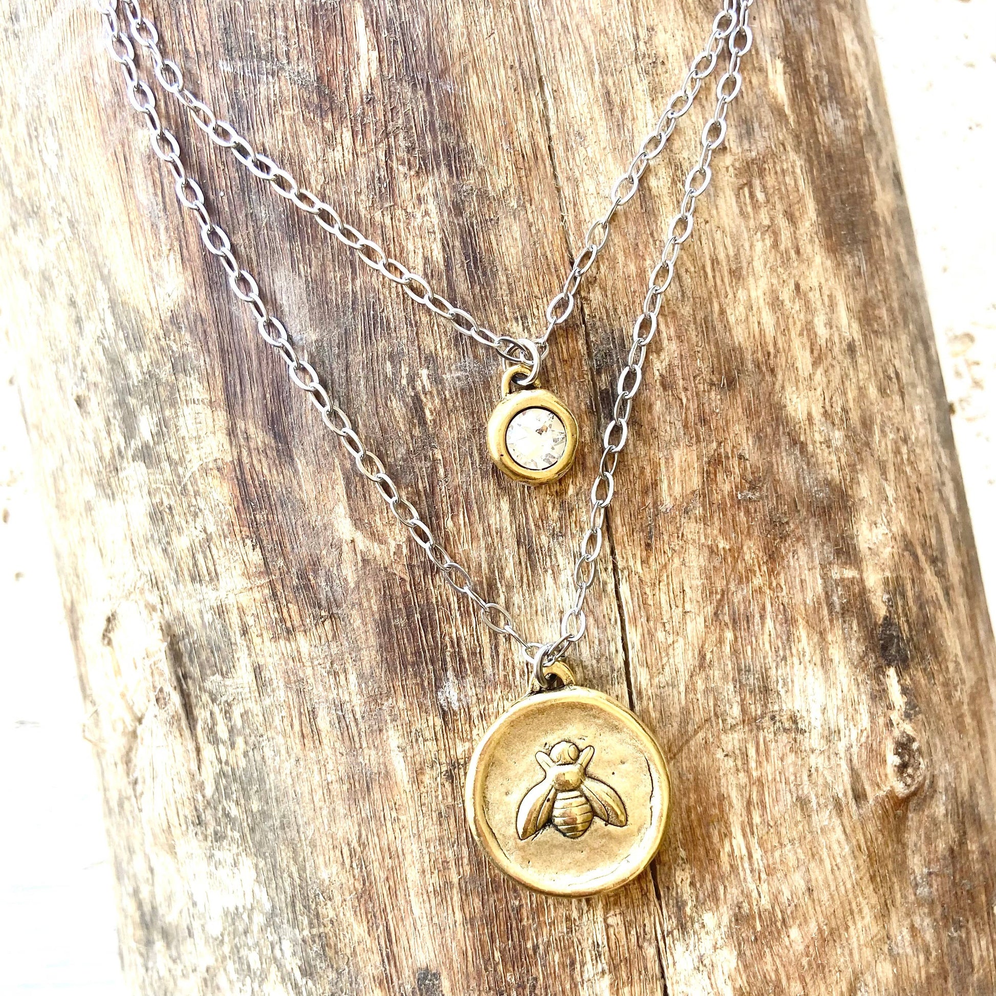 How cute are these coin necklaces? Two layers (one piece) hand casted bees coins. If you turn them over you will see 3 fleur de lys symbols. Stainless steel chain and adjustable up to 20”