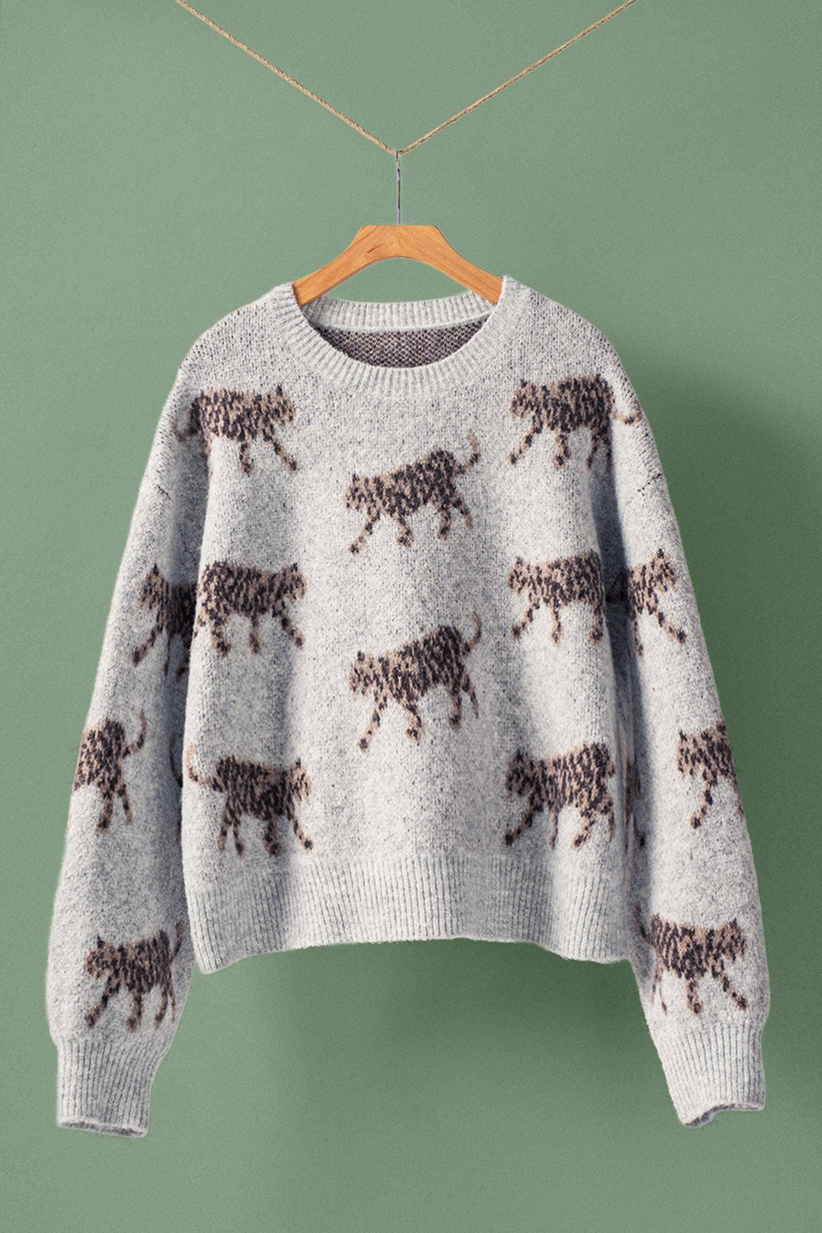 Cozy Knit Leopard Pattern Crewneck Sweater